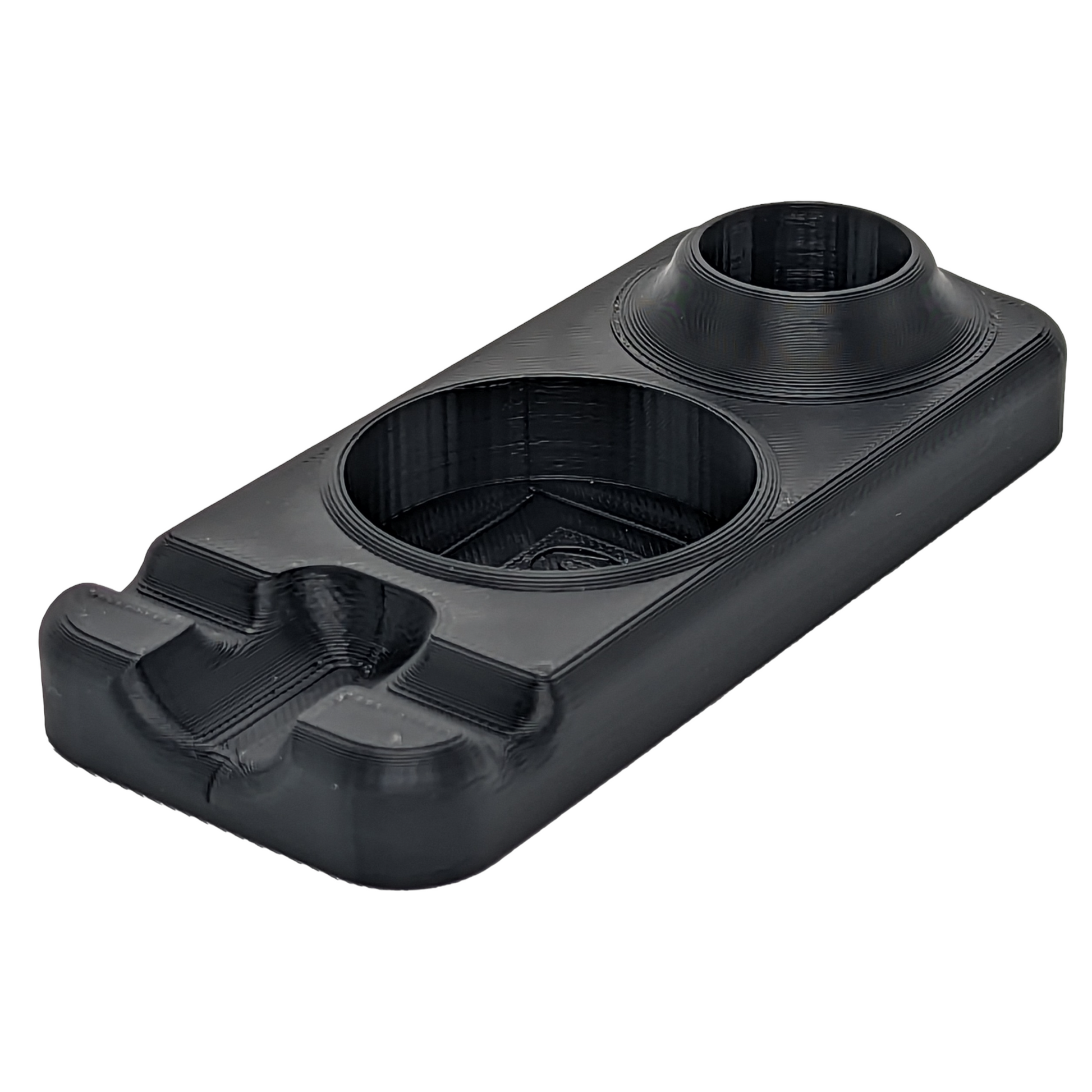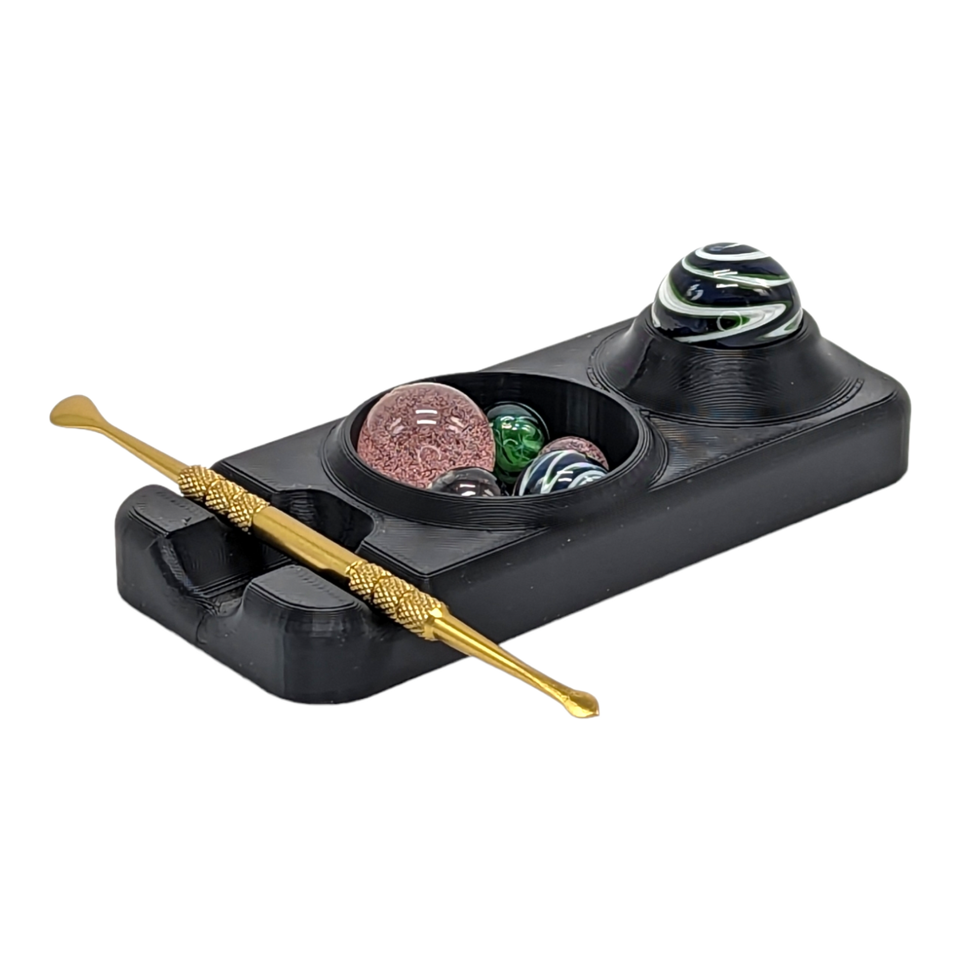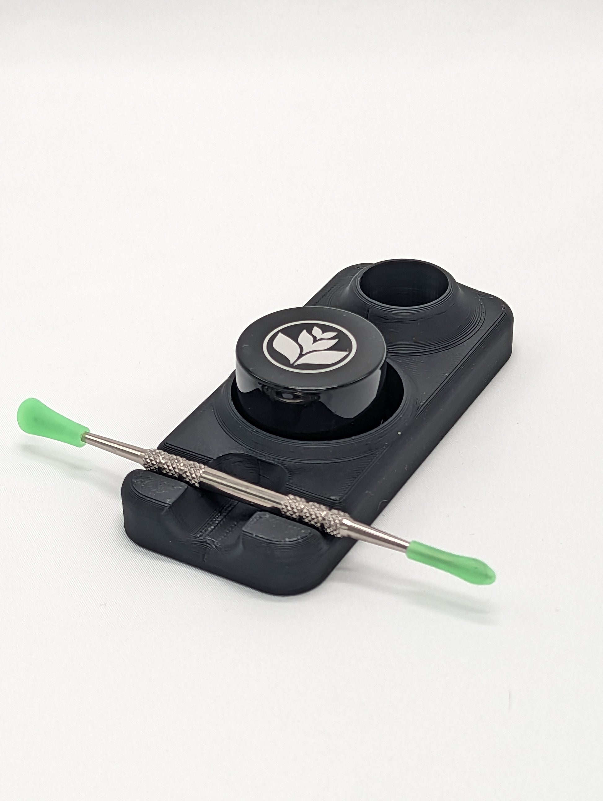 This stand is specifically designed to accommodate one dabber, one carb cap (or marble) and a jar, so you can keep your tools organized and within reach whenever you need them. Its minimalist design complements any décor, and its compact size makes it easy to store and transport. Plus, its durable 3D-printed PLA construction ensures that it will last for years to come and is easy to clean while keeping your desk/surface area clean as well.