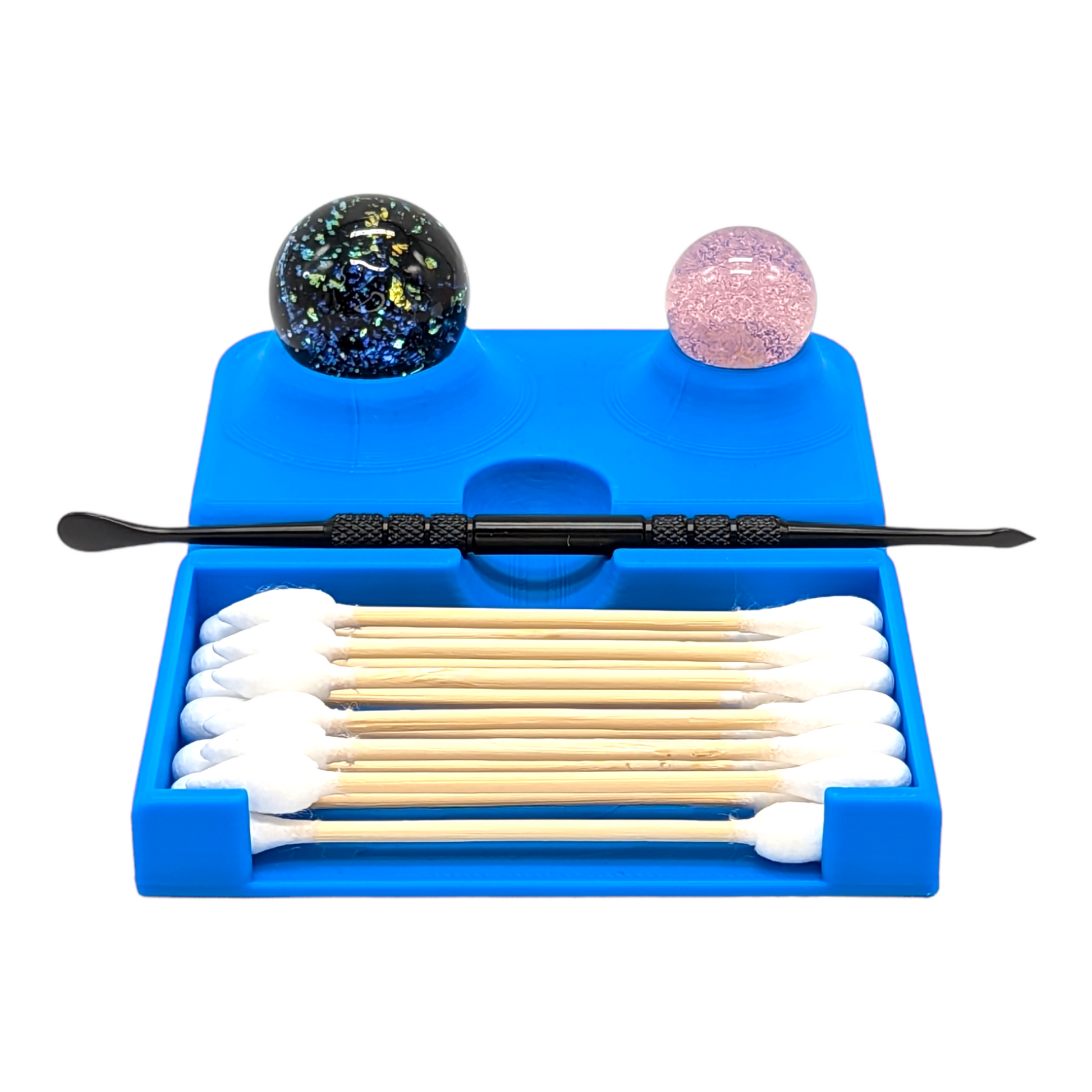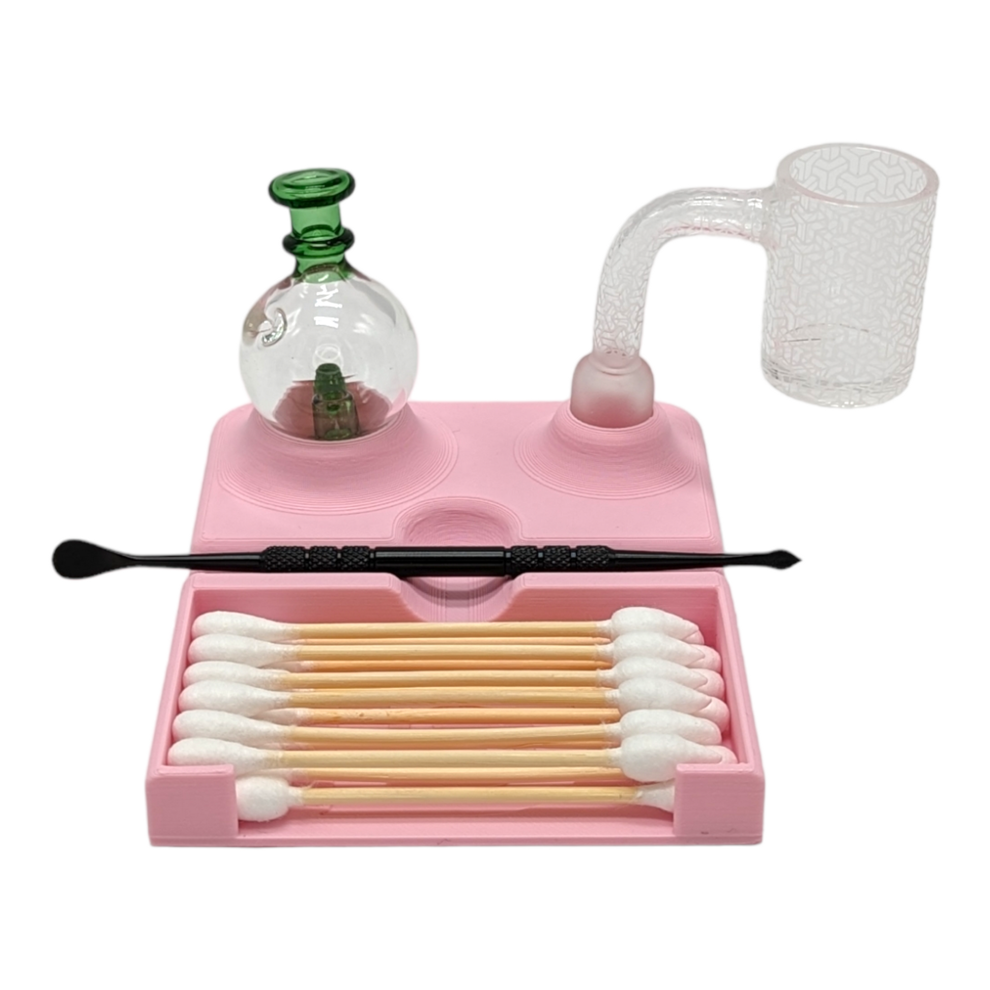This stand is specifically designed to accommodate one dabber, one carb cap (or marble), one bucket and Cotton Swabs, so you can keep your tools organized and within reach whenever you need them. Its minimalist design complements any décor, and its compact size makes it easy to store and transport. Plus, its durable 3D-printed PLA construction ensures that it will last for years to come and is easy to clean while keeping your desk/surface area clean as well.