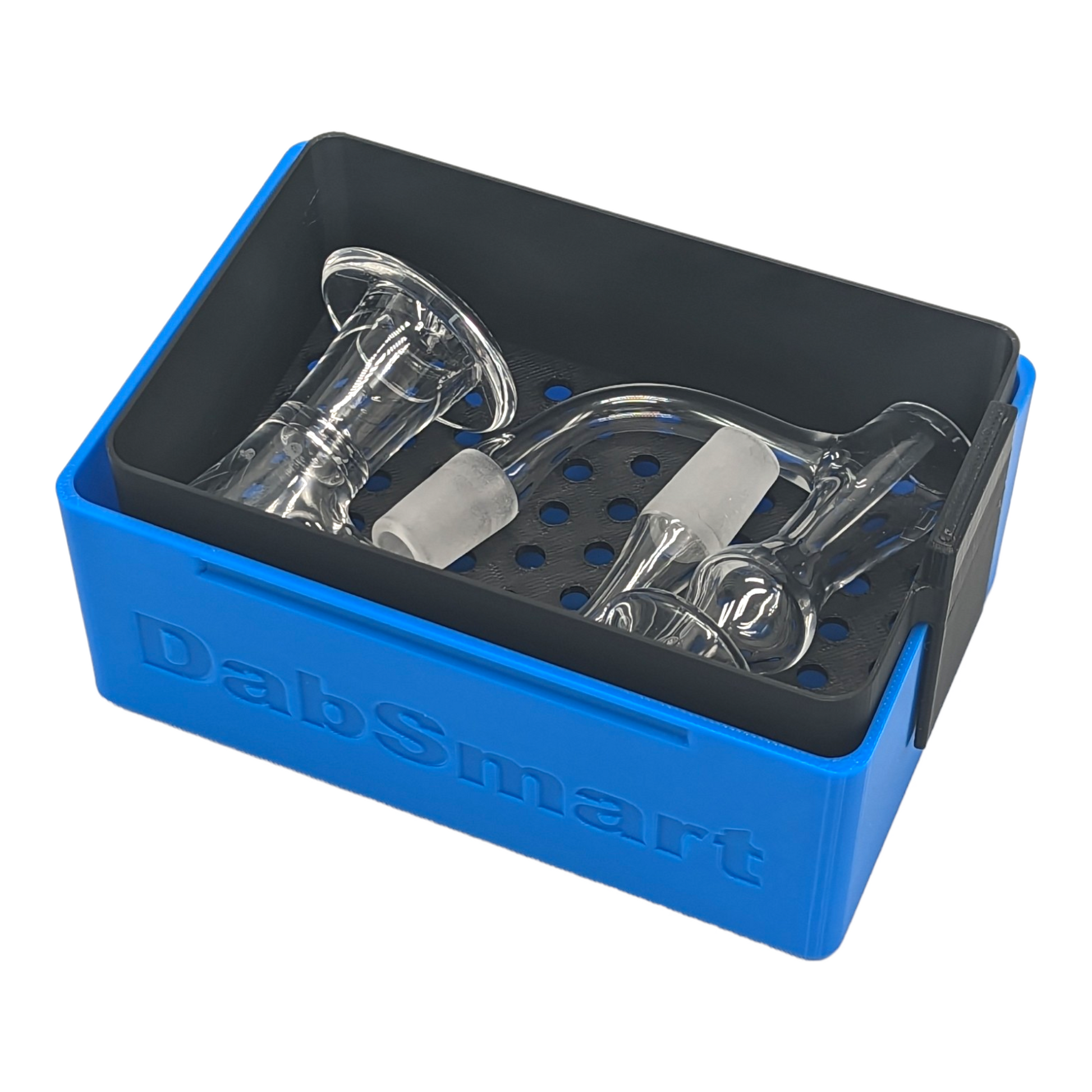 Comes with a snap on lid and 1 inserts baskets that have handles which alow you to hang it on the side for air drying your glass.