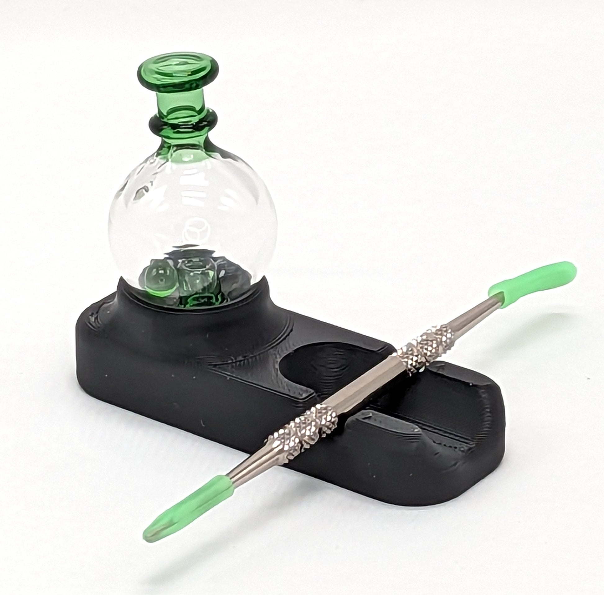 This stand is specifically designed to accommodate one dabber and one carb cap (or marble), so you can keep your tools organized and within reach whenever you need them. Its minimalist design complements any décor, and its compact size makes it easy to store and transport. Plus, its durable 3D-printed PLA construction ensures that it will last for years to come and is easy to clean while keeping your desk/surface area clean as well.